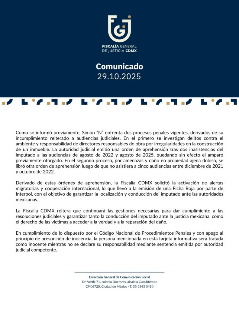 La fiscalía de la CDMX comunicó a través de su cuenta de X, que Simón Levy, ex subsecretario de planeación turística de México, fue detenido por Interpol en Portugal con fines de extradición el 29 de octubre de 2025, debido a dos órdenes de aprehensión vigentes: una por delitos contra el ambiente y responsabilidad de directores responsables de obra, y otra por amenazas y daño en propiedad ajena doloso.